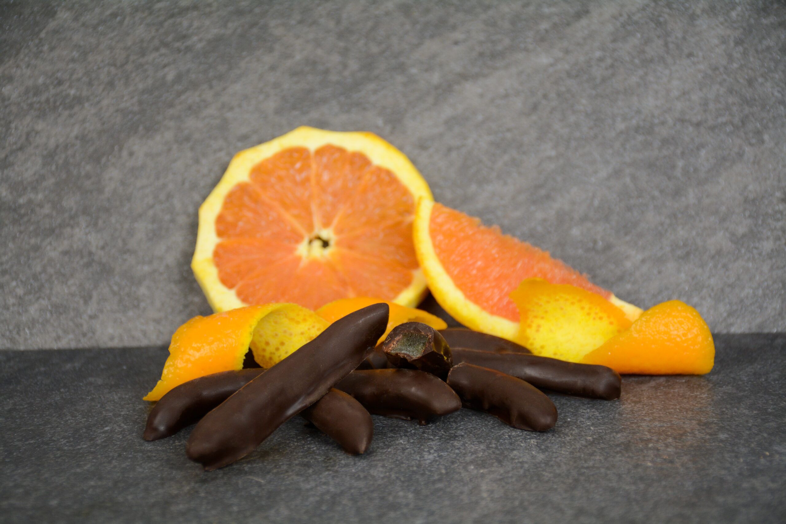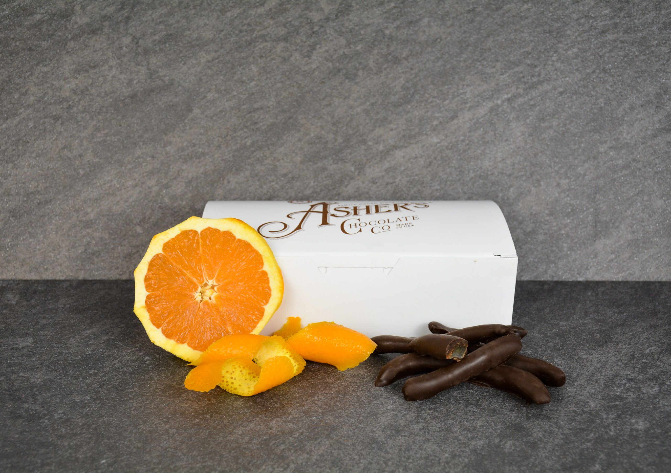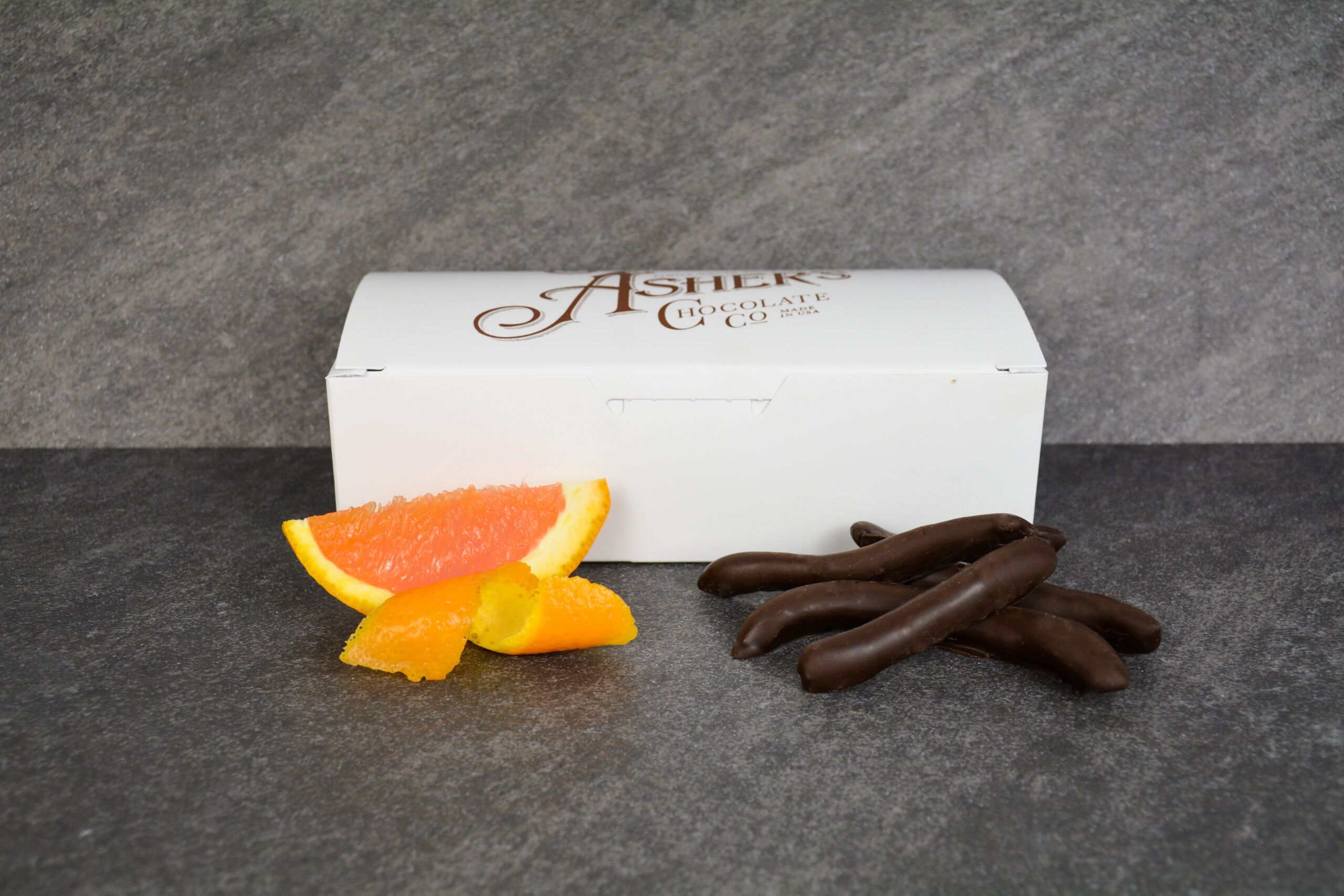 Asher’s Dark Chocolate Orange Peel. Need we say much more? We make this zesty confection by heating orange peels in sugar until they become sweet and tender. Employees then coat the mixture in our delicious dark chocolate, providing the perfect counterpunch to the sweetness of the center.
