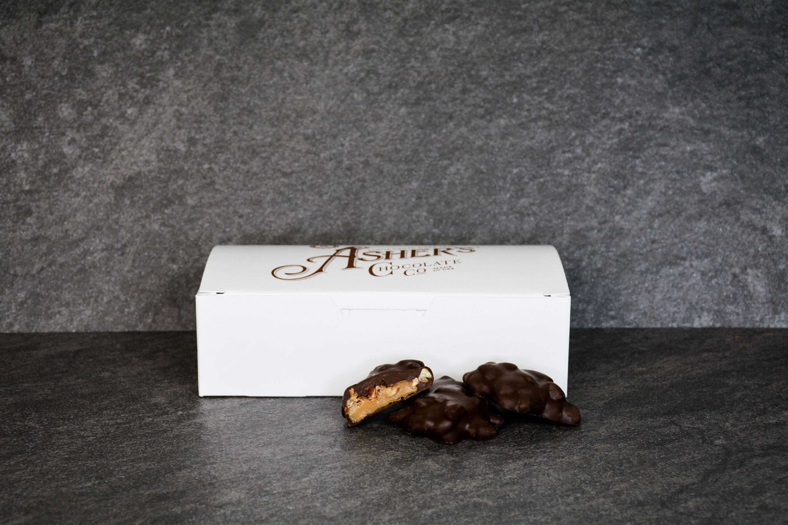 Treat yourself to a luxurious experience with our Dark Chocolate Pecan Caramel Patties. Each piece is meticulously hand-packed into a one-pound box. They feature our signature dark chocolate, succulent pecans, and gooey caramel center. Asher’s customers rejoice in celebration of their rich flavors and indulgent textures.