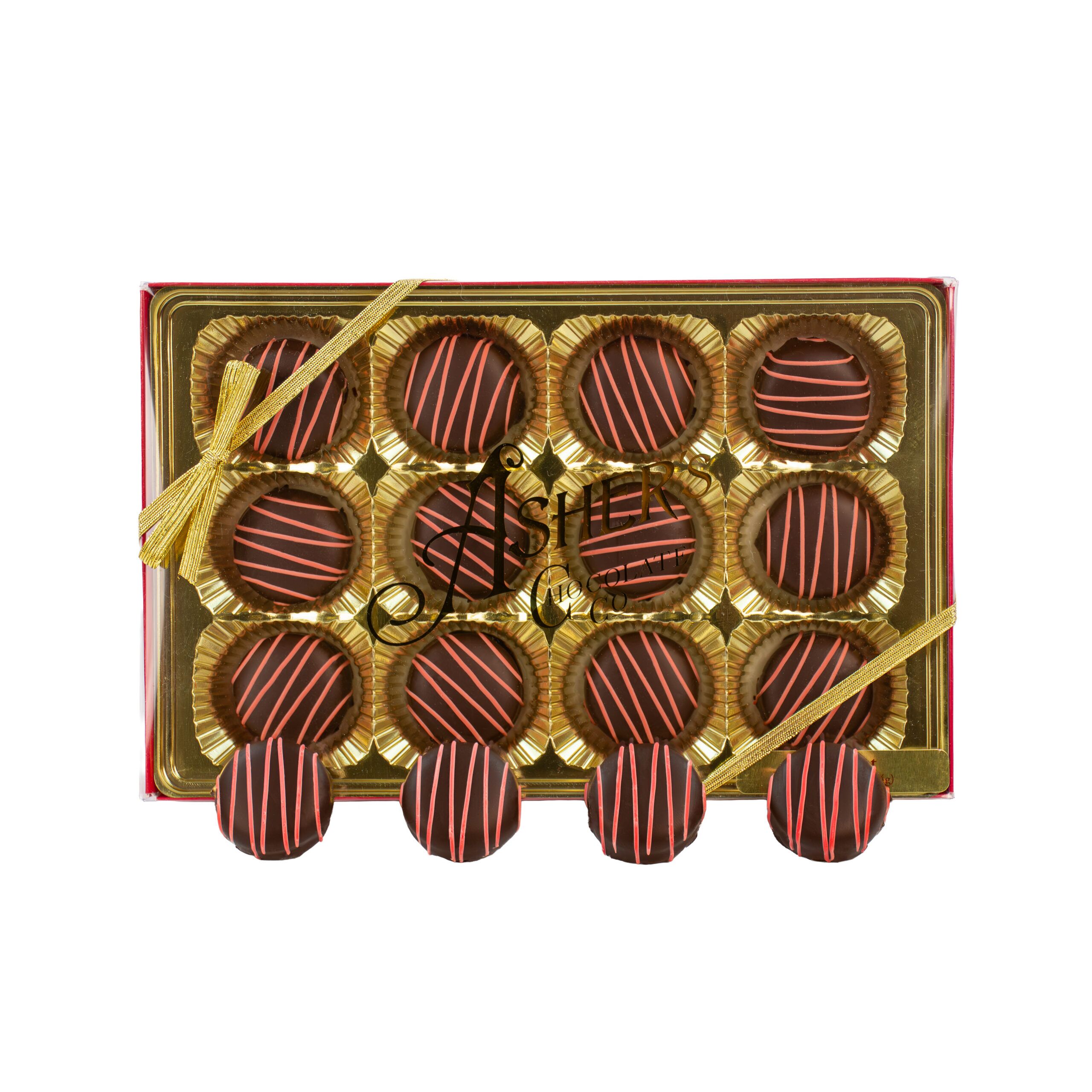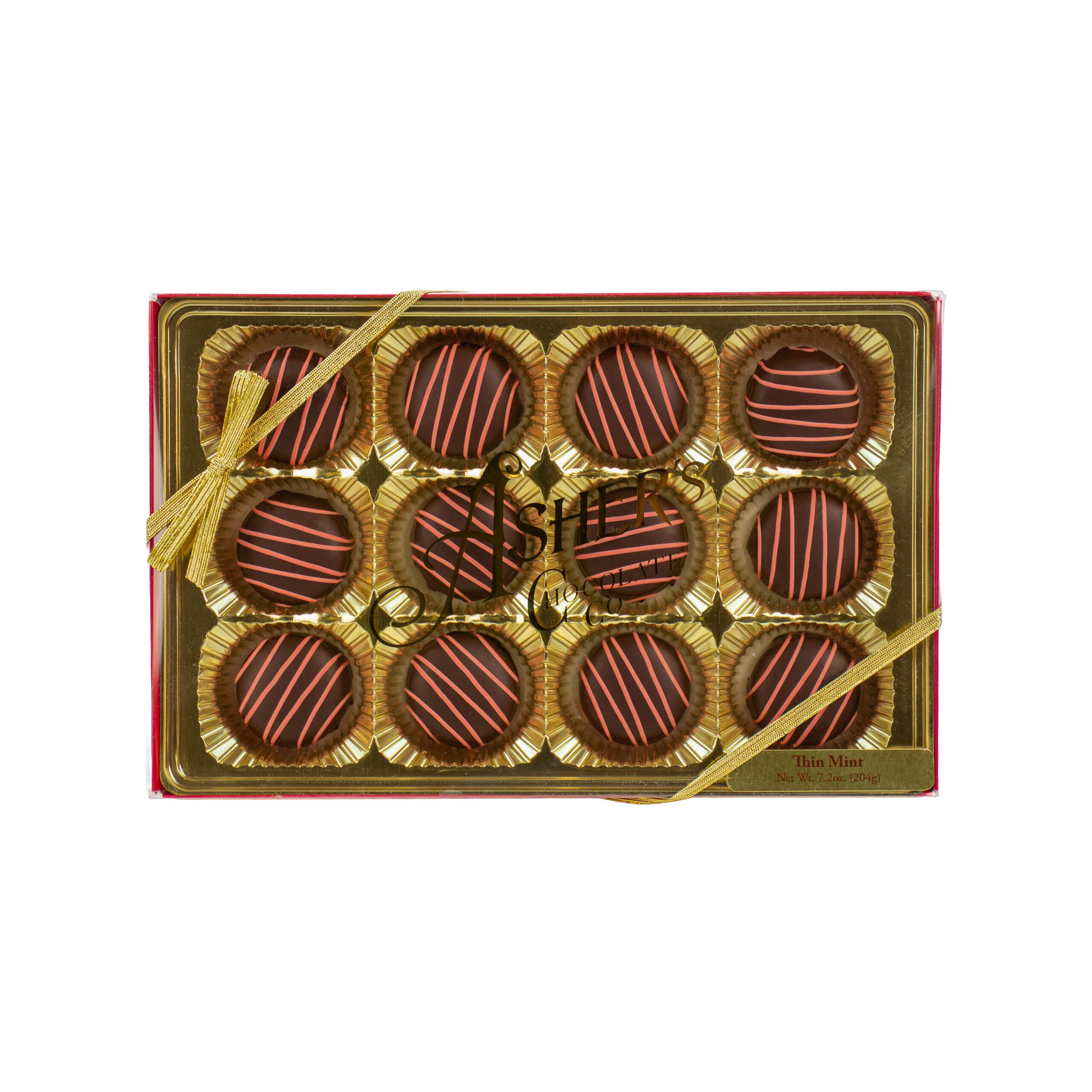 Refresh your senses and elevate your chocolate game with Asher’s Dark Chocolate Thin Mint Grab-a-Gift Box—a striking blend of bold flavors and refined presentation. Inspired by timeless classics and finished with a festive twist, this 12-piece set delivers a cool, crisp bite wrapped in deep chocolate decadence.