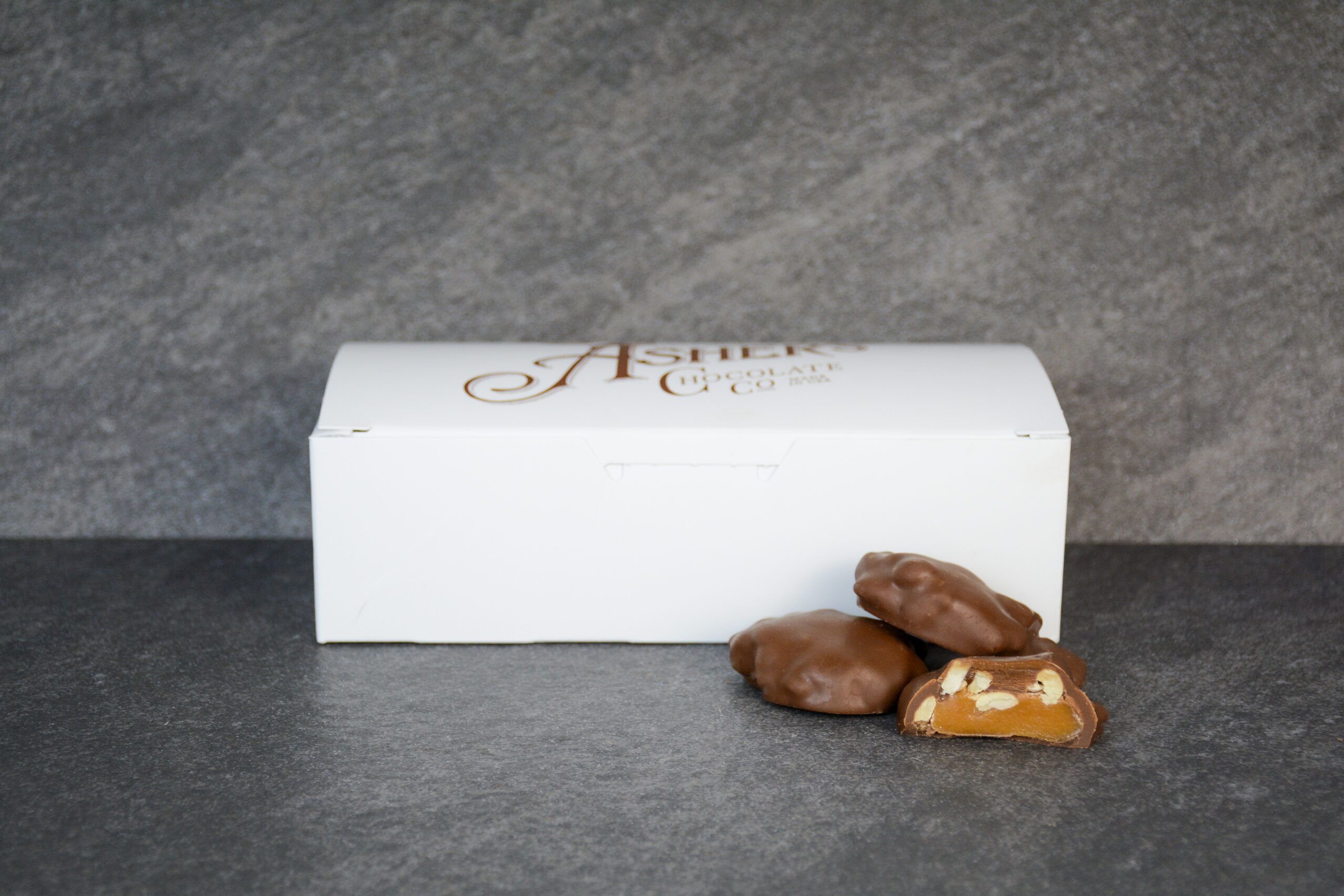 Experience the epitome of excellence with Asher’s Milk Chocolate Cashew Caramel Patties, meticulously hand-packed into a one-pound box. These patties boast our signature milk chocolate, buttery cashews, and luscious caramel for a delightful flavor medley.