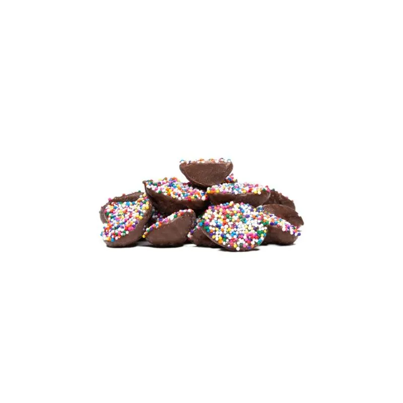The addition of Milk Chocolate Nonpareils to any celebration instantaneously provides a pop of sweetness to the party! Adults and children alike will enjoy the beautiful rainbow sprinkles that decorate the bottom of the candies. Not only do these candies look amazing, they also taste amazingly scrumptious! Our milk chocolate tastes smooth and creamy while the nonpareil seeds provide a crunch that’s to die for!