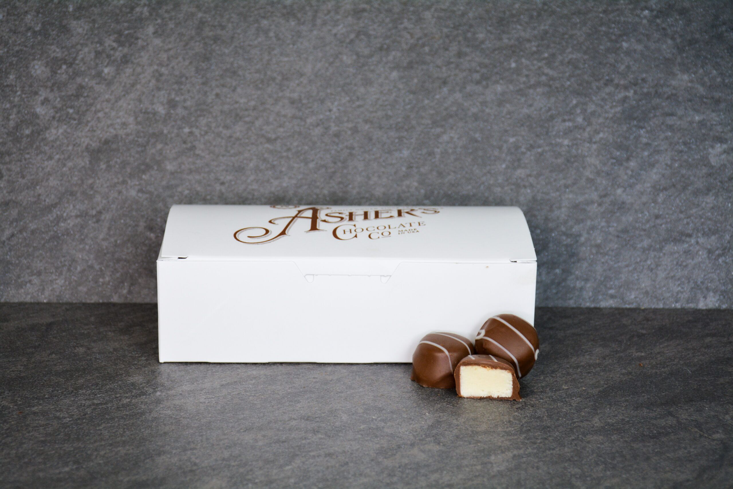 Savor the decadent fusion of smooth milk chocolate and velvety buttercream in every bite with Asher’s Milk Chocolate Vanilla Buttercreams. Hand-packed in a one-pound box, each piece promises pure indulgence.
