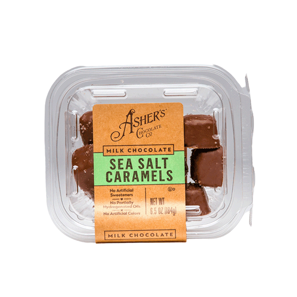 This combination tastes truly divine! And, we make sure to pack these heavenly pieces in a container that guarantees their freshness. We never cut corners when crafting our pieces. So, when it comes to packing them in way that ensures your chocolate gets delivered to you in tip top shape, we make it happen! Our plastic resealable Fresh Pack containers represent the best way to snack. Simply reseal the lid between snacking so your treats stay delicious inside. Snacking made easy, with Asher’s! Enjoy our Milk Chocolate Sea Salt Caramels!