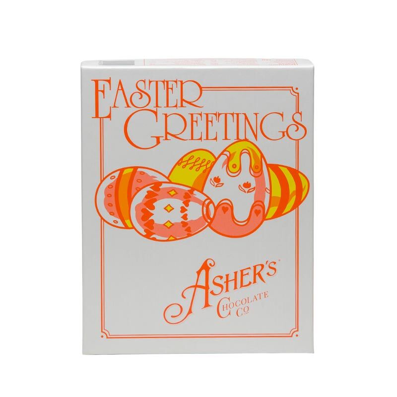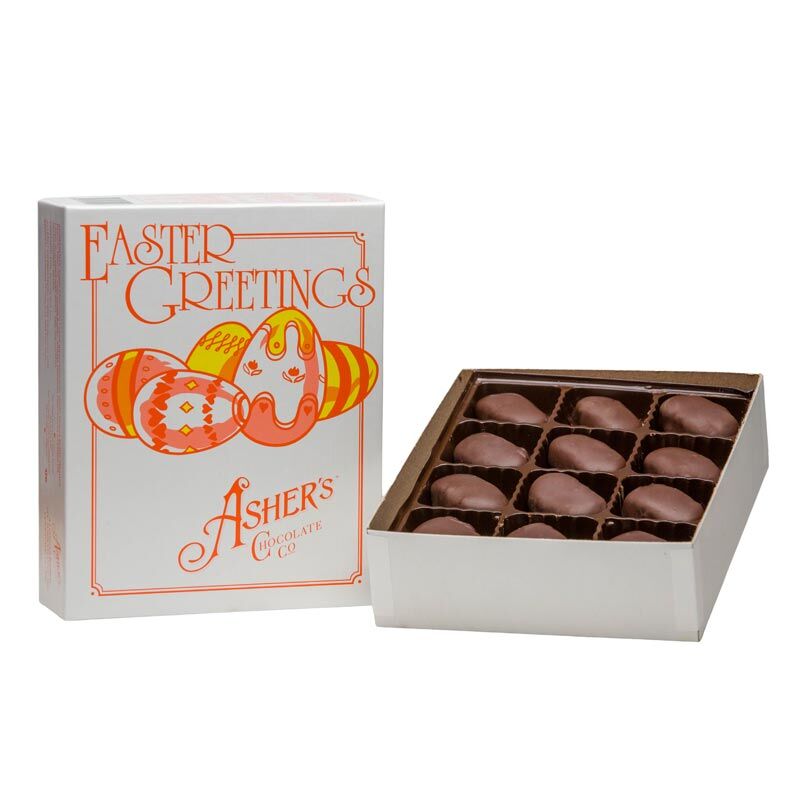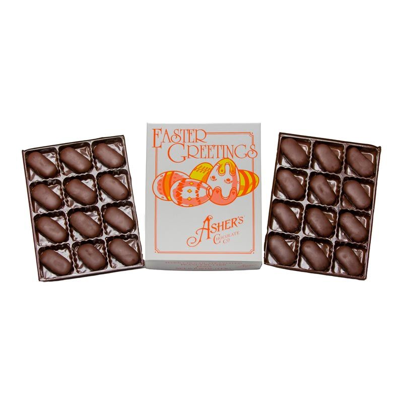 Each beautiful box contains 1 lb. of petite dark chocolate peanut butter eggs. This sweet is made with Asher’s magic and top-secret ingredients known only by our expert chocolate makers. Wow! A perfect Easter goodie ready especially for you! In each box, that showcases original artwork, you will enjoy 24 petite eggs. The eggs are bite- sized, poppable, and ready to be enjoyed all spring season long. Make your Easter Baskets extra special by adding a box of Asher’s Old-Fashioned 24pc. Eggs!