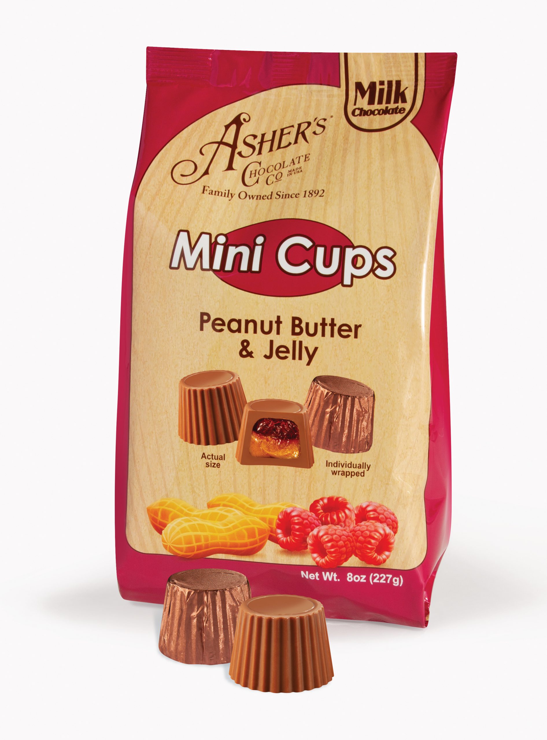 The Peanut Butter and Jelly Mini Cups come in an 8 oz. bag filled with approximately 18 individually foil wrapped pieces. The beautiful pinkish-brown foil lets chocolate cravers know the flavor of the piece about to be enjoyed. Upon first bite, your taste buds will explode with a sweet and savory classic of creamy peanut butter and raspberry jelly. Asher’s signature milk chocolate shell enhances the sweetness of the nostalgic filling.